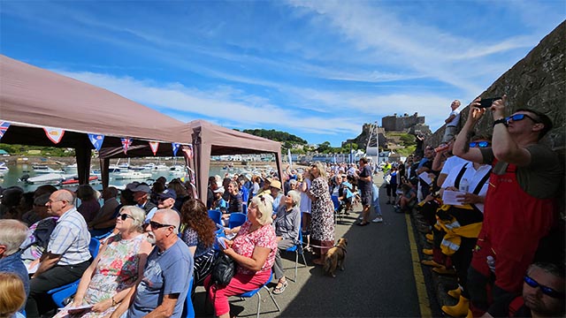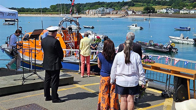 Sir Max Aitken III and Albert Pinel left the harbour in St Helier and arrived in Gorey at 10:30am. We thoroughly enjoyed the fly past from Channel Islands Air Search. As the blessing of the boats and the service of remembrance commenced, we were humbled by the words from Rev’d Jeff Wattley of Gouray Church, and were pleased to also see the Rev’d Pete Stone – Rector of St Martin’s Church – also in attendance. Also present were Captain Bill Sadler of Ports of Jersey with Jersey Coastguard’s pilot boat, plus Jersey Fire & Rescue, Channel Islands Air Search, RNLI Jersey and ourselves. Thanks also to Gorey Boat Owners Association.